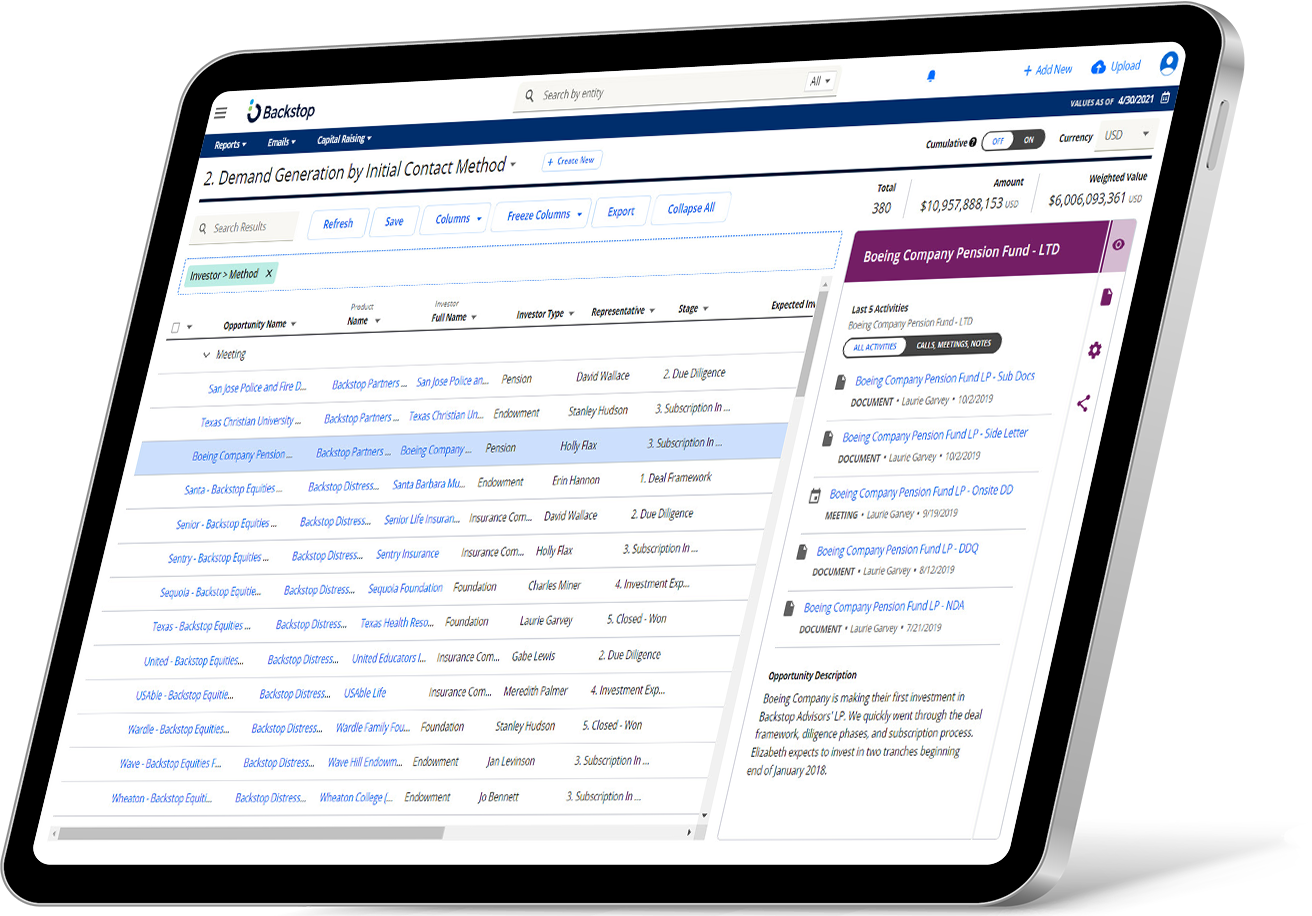 Discover a dynamic, adaptable platform that will truly set your firm apart. Backstop empowers you with the ultimate single source of truth, revolutionizing how you raise and retain capital, supercharge business development, and foster meaningful connections with allocators, consultants, and other industry participants in your universe. Unlock your firm’s full potential today.