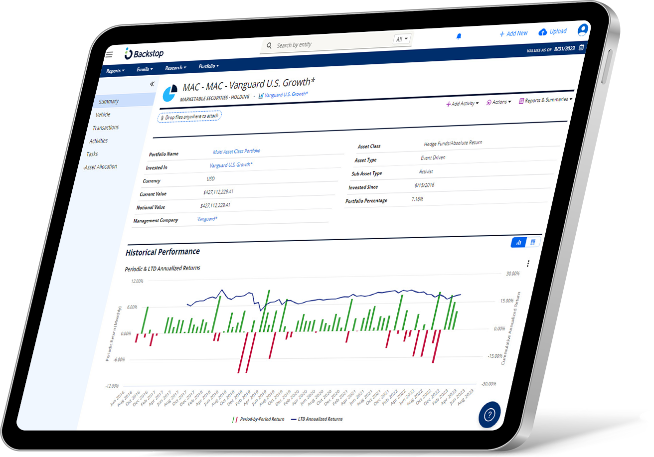 Backstop is your trusted ally in optimizing the investment and client life cycle. Our solutions create a single source of truth for multi-asset research and portfolio management, driving prospect and client satisfaction, fostering loyalty and ensuring long-term retention. Stay ahead of the competition with Backstop’s cutting-edge solutions.