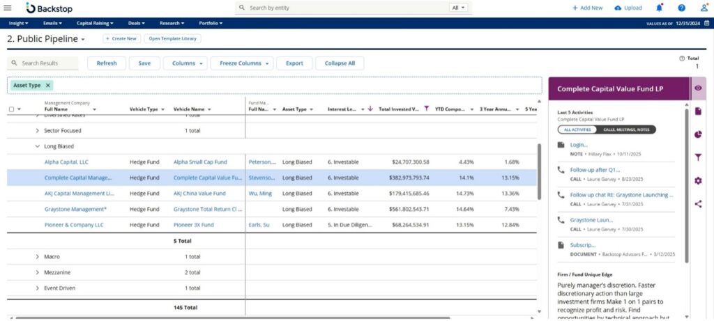 Investment research is highly specialized. Each asset class has unique data requirements — private equity teams track closed dates and investment periods, while hedge fund teams drill into risk mitigation and drawdown performance. Backstop Research Management System allows teams to design solutions tailored to their asset class while consolidating all information into a single platform.