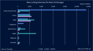 Favorable policies by both the China Securities Regulatory Commission (CSRC), China’s main capital markets regulator and HKEX, Hong Kong’s stock exchange operator, have encouraged Chinese and foreign firms to choose Hong Kong for their debut or dual listings. So far this year (as of 9 March 2026), Hong Kong has recorded 27 new listings, raising a combined USD 11.6bn and already surpassing the USD 11.3bn raised in the whole of 2024.