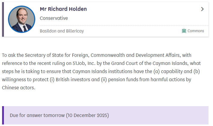 Shadow transport secretary Richard Holden referenced the Cayman Grand Court’s 51job ruling on 5 December when he tabled a series of written questions in the House of Commons directed at Yvette Cooper, the UK foreign secretary, and David Lammy, the justice secretary.