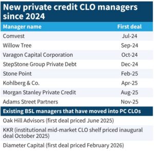 Despite a slow start to 2026, there is still plenty of activity behind the scenes, and the sense is that once the software panic dies down, and the geopolitical environment becomes clear, a wave of deals will hit the market. “The expectation is that private credit CLOs will continue to represent a larger percentage of the CLO universe when compared historically,” says Eric Hudson, co-head of global structured credit at KBRA. “I do think it will be probably in line with what we’ve seen last year.”