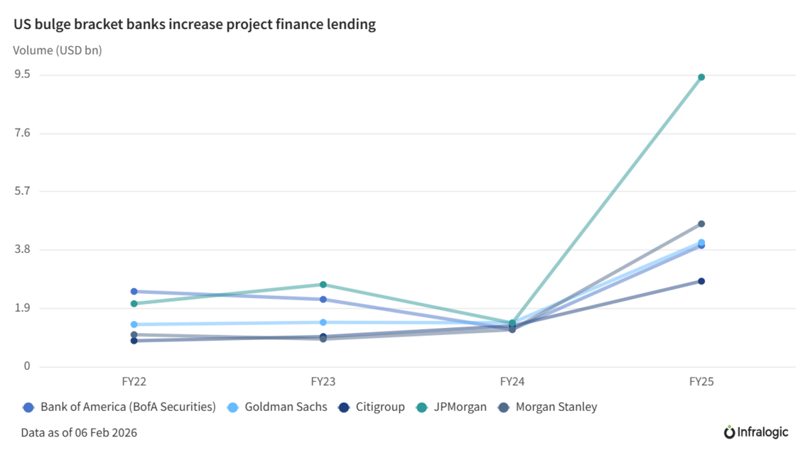 According to Infralogic data on US project finance deals, the five American bulge bracket banks moved up significantly in the 2025 rankings versus 2024. The highest-ranking of the five, JPMorgan, rose 22 spots to sixth place via a 562% increase in the volume lent year over year. The remaining bulge bracket banks grew by 182% (Goldman Sachs), 285% (Morgan Stanley), 225% (BofA), and 109% (Citigroup) year-over-year, respectively.