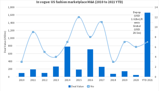 North American firms have spent USD 1.66bn year-to-date on acquiring online marketplaces that peddle new or used fashions – more than the peak years of 2014 (USD 779m) and 2016 (USD 709m) combined.