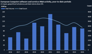 European software M&A flows this year reflect that uncomfortable shift, with activity cooling as some suitors play the waiting game to see how AI technologies impact the space.