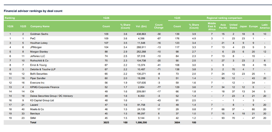 In this context, it is perhaps unsurprising to see that the top 10 financial advisors by deal count all saw their hauls fall versus 1Q25, with joint gold medallists Goldman Sachs and PwC down 21.6% and 38%, respectively, with 109 mandates apiece. Houlihan Lokey climbed into the bronze position from fifth last year, racking up 107 deals, down 13% YoY.