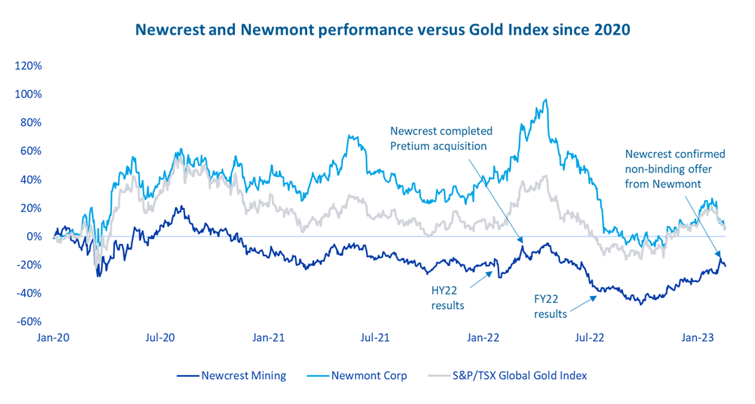 On a multiples basis, the Newmont proposal provided a 8.54x EV/EBITDA valuation for Newcrest. This is a little below the multiple of other billion-dollar gold miner deals in recent years, which have fetched a median EV/EBITDA of 9.2x. Among them, Newcrest’s USD 2.8bn acquisition of Pretium Resources in 2021 was completed at 8.97x. Kirkland Lake Gold paid 13.21x EBITDA to purchase Canada’s Detour Gold in a USD 3.7bn deal in 2019 while Newmont’s own USD 12.7bn acquisition of GoldCorp in 2019 valued the Canadian miner at 12.97x EV/EBITDA.