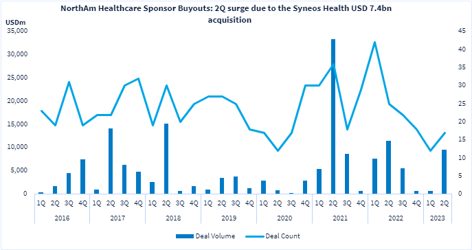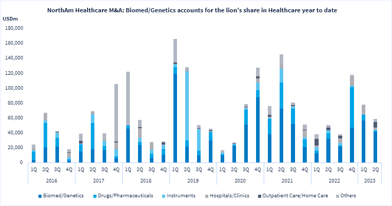 In the sector – comprising pharma and biotech, healthcare services, information technology and medtech – North America saw more deal volume than any other global market in 1H23, according to Dealogic data. The 2Q saw a surge, largely due to the USD 7.4bn Syneos Health acquisition, while biomed and genetics make up the lion’s share of deal volume year to date.