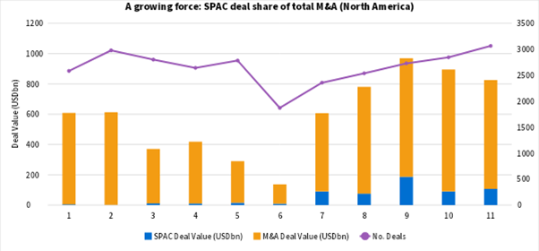 Blank check companies, as they are also known, accounted for 17% of overall M&A activity in North America during 1Q-3Q21, compared to just 0.3% in 2019.