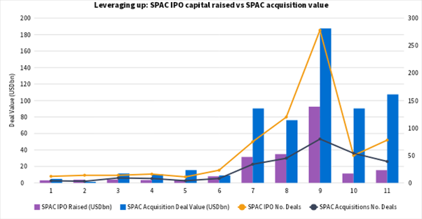 So far this year, SPAC acquisitions have averaged USD 2.52bn. Given that is 8.5 times the average SPAC IPO, it suggests the current crop of target-hunters could drive in excess of USD 1tn in deal making over the next year or so. Such immense buying power, combined with the time constraints for a deal, will lead to continued valuation inflation.